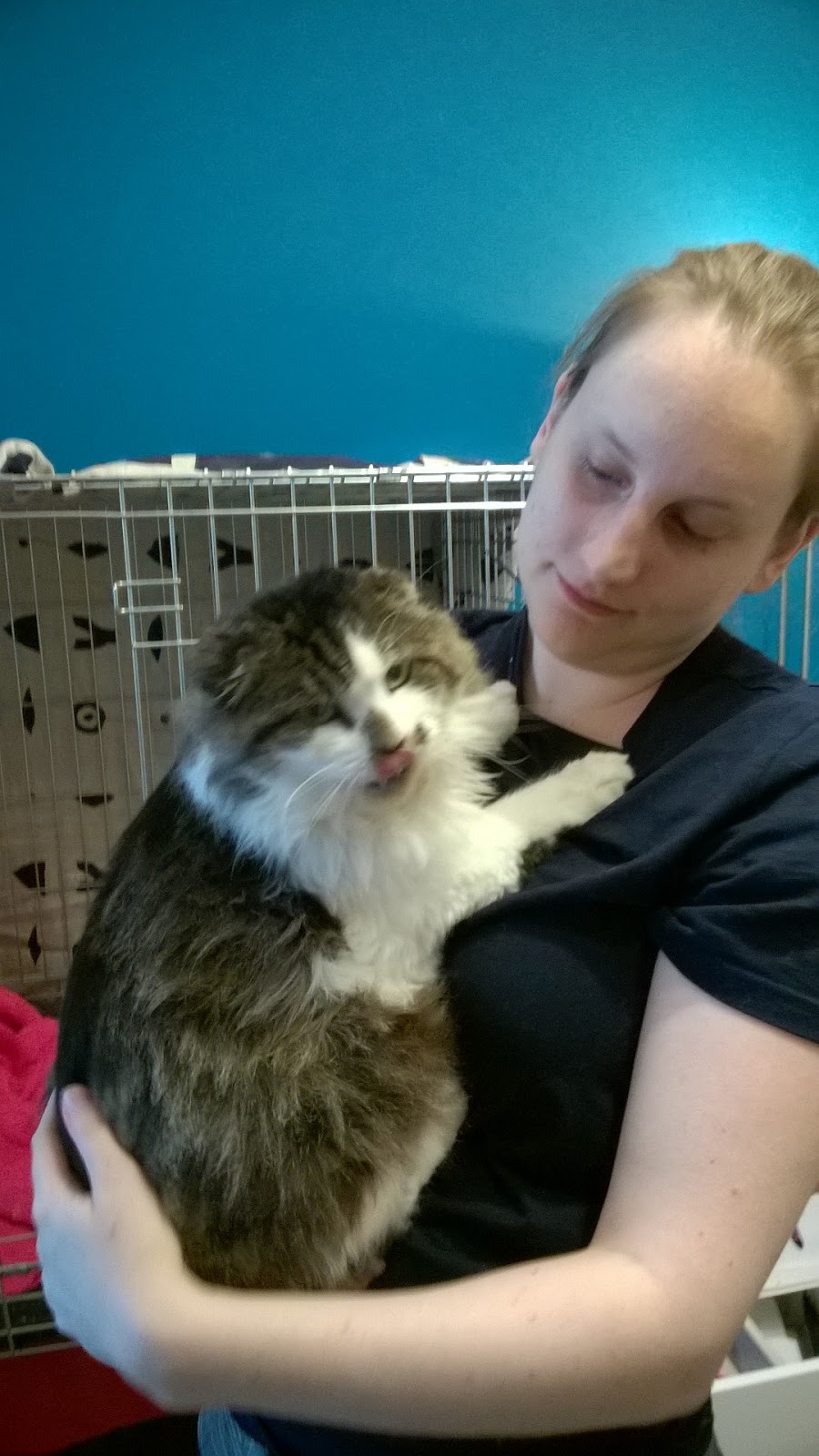 Teddy kwam bij ons omdat hij FIV+ was, en het alternatief inslapen was. Alsof hij begreep dat hij zijn leven aan ons te danken had, nam hij ons stevig vast in zijn berenpootjes van zodra hij daar de kans toe zag. En al is hij naar vreemden toe nog steeds wat verlegen, hij is zo’n lief dier!